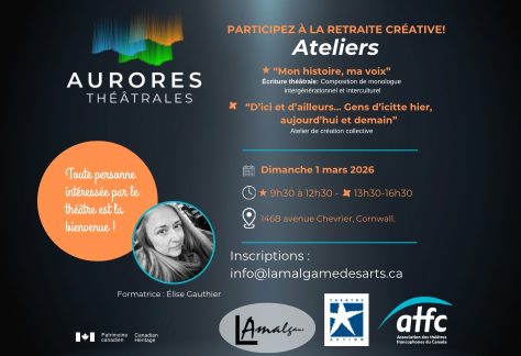 Dans le cadre du projet Aurores Théâtrales, proposé par L’Association des théâtres francophones du Canada – ATFC ) et Théâtre Action , nous avons le plaisir de vous inviter le 1er mars 2026, de 9h30 à 16h30, au centre Charles-Émile-Claude pour une journée consacrée à la création littéraire.